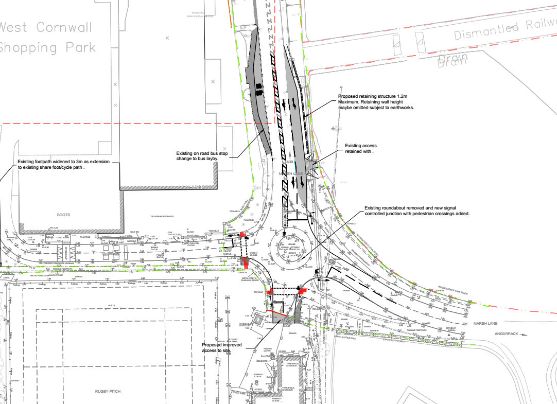 5 No part of the development hereby approved shall be occupied or brought into use until the highway improvement works to the A30/Carwin Rise/Marsh Lane junction (the "Loggans Moor Roundabout") as shown on Hydrock drawing number 14165-T001 Revision D dated 07/01/2015, are complete and open to traffic.