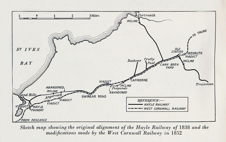 The Hayle Railway. Originally ran eastwards to Redruth, and from Redruth Junction north to Portreath and south to Tresavean, again built to profit from the mining industry's need to transport ore for shipping. It opened in stages after December 1837. Steam locomotion was used from the start, giving the route an early advantage over the Redruth and Chacewater line. Cornubia, one of the locomotives later taken over by the West Cornwall Railway in 1846, was built at Copperhouse Foundry in 1838, probably the first engine to be made in Cornwall. Notable features of the line were the steep inclines at Angarrack and Portreath, where wagons were hauled by ropes. Inclines at Penponds and Tresavean worked on a counterbalancing principle. Passengers has sometimes travelled in the open wagons, but the first passenger service between Hayle and Redruth took place on 12th May 1843.