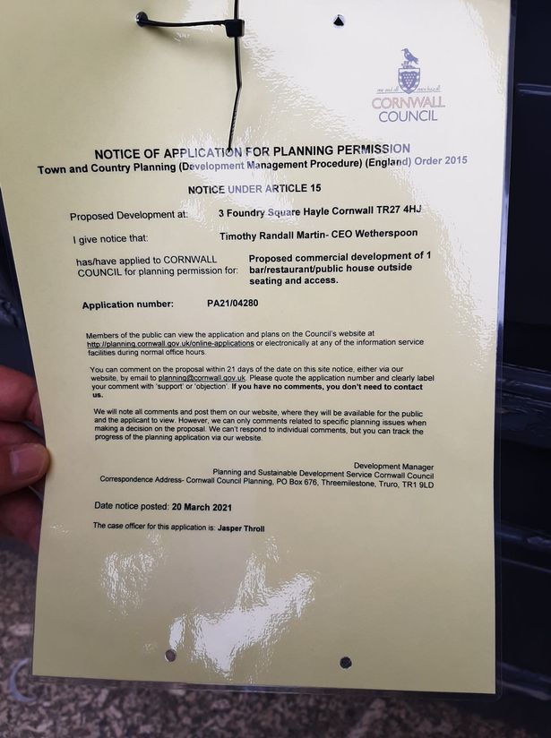 It read: "Proposed development at: 3 Foundry Square Hayle Cornwall TR27 4HJ. I give notice that Timothy Randall Martin - CEO Wetherspoon - has/have applied to Cornwall Council for planning application for: Proposed commercial development of 1 bar/restaurant/public house outside seating and access".