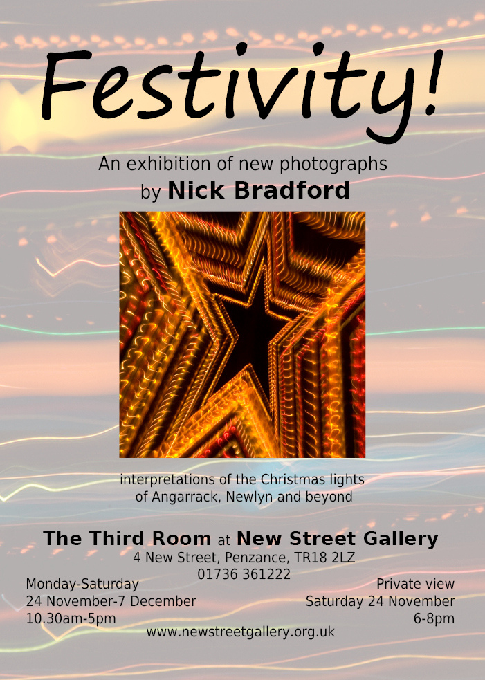 If you enjoy the Christmas lights of Angarrack and Newlyn, you'll love this exhibition of photography by Nick Bradford that celebrates the ingenuity of the light creators, while presenting the amazing illuminations as they've never been seen before. Angels come alive, stars explode and snowflakes dance. The images are startlingly fresh as Nick experiments with his camera to create vivid new imagery - without the aid of Photoshop!