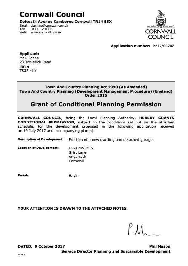 - 170719 | PA17/06782 | Erection of a new dwelling and detached garage. - Land NW Of 5 Grist Lane Angarrack Cornwall