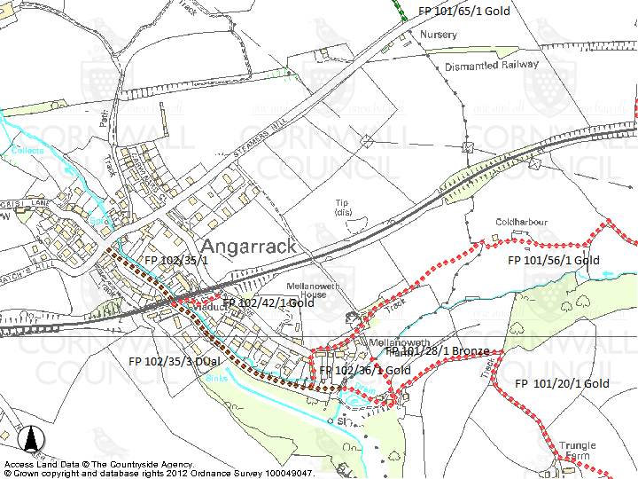 BR from Angarrack Lane to a point north of Angarrack Lane at Parish Boundary, and joins Hayle BR 47 CC Priority GOLD ***** 0.03 miles. Through Bridleway, section of 102/47