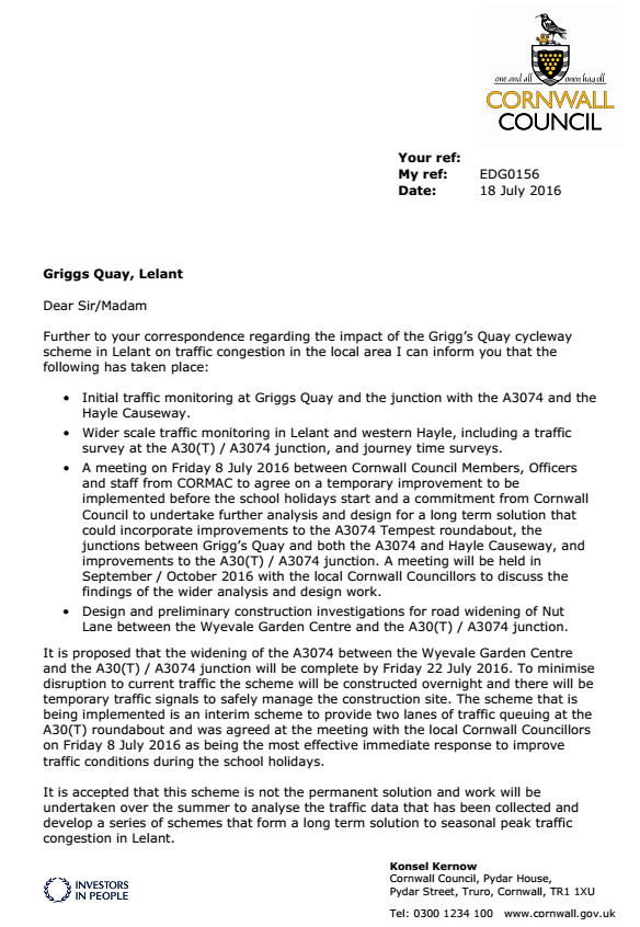 Further to your correspondence regarding the impact of the Grigg’s Quay cycleway scheme in Lelant on traffic congestion in the local area I can inform you that the following has taken place: