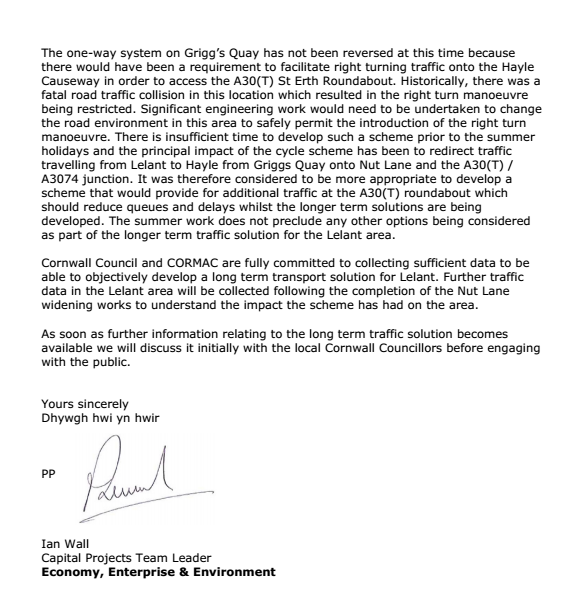 The one-way system on Grigg’s Quay has not been reversed at this time because there would have been a requirement to facilitate right turning traffic onto the Hayle Causeway in order to access the A30(T) St Erth Roundabout. Historically, there was a fatal road traffic collision in this location which resulted in the right turn manoeuvre being restricted. Significant engineering work would need to be undertaken to change the road environment in this area to safely permit the introduction of the right turn manoeuvre. There is insufficient time to develop such a scheme prior to the summer holidays and the principal impact of the cycle scheme has been to redirect traffic travelling from Lelant to Hayle from Griggs Quay onto Nut Lane and the A30(T) / A3074 junction. It was therefore considered to be more appropriate to develop a scheme that would provide for additional traffic at the A30(T) roundabout which should reduce queues and delays whilst the longer term solutions are being developed. The summer work does not preclude any other options being considered as part of the longer term traffic solution for the Lelant area.