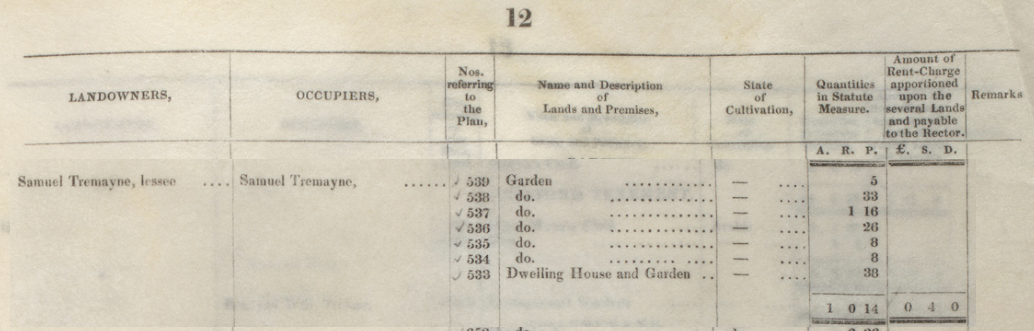 - 1842 Tithe | Carwyn T539,538,537,536,535,534,533 Dwelling House and Gardens Samuel Tremayne